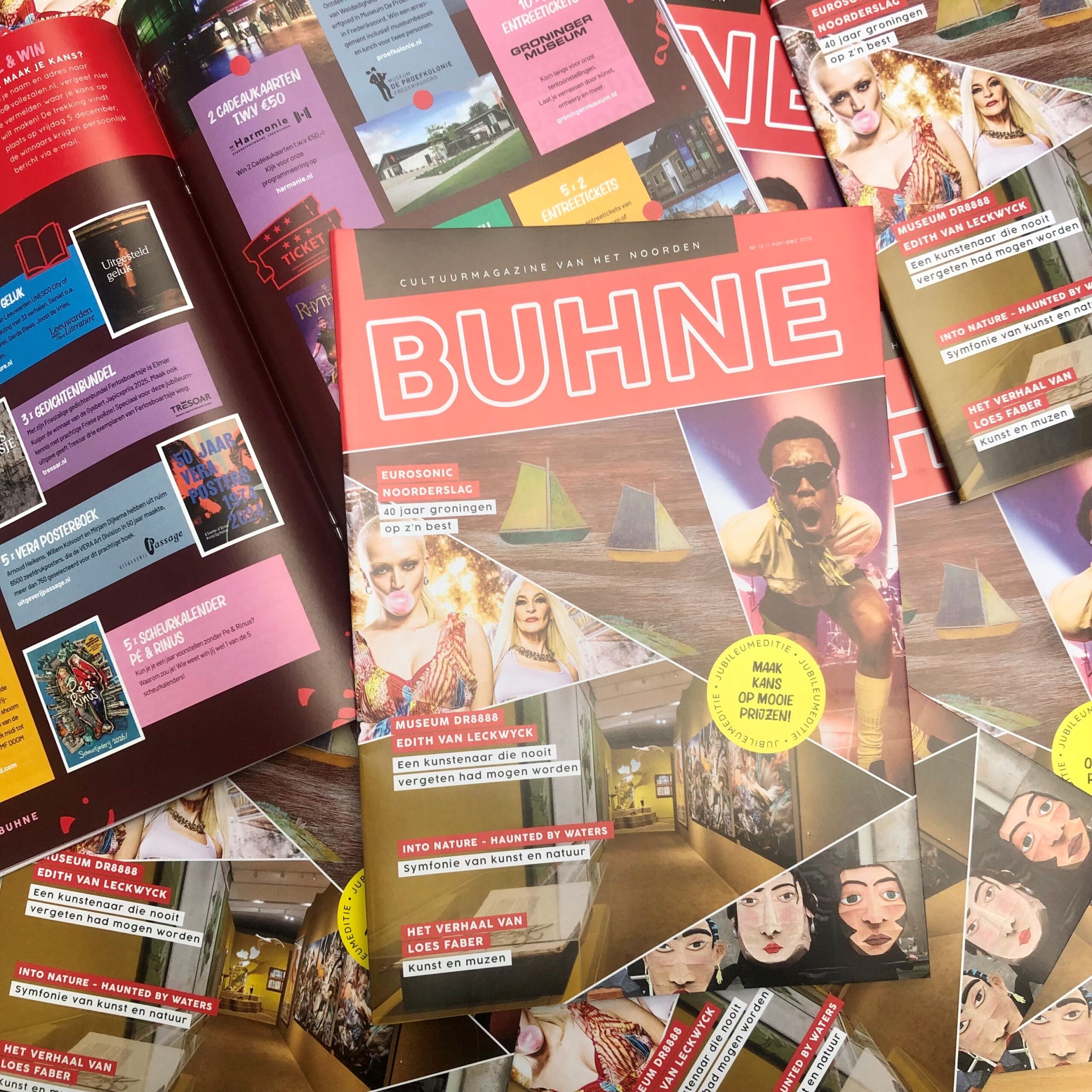 Vanaf 31 oktober 2020 is ‘BUHNE’: hét nieuwe cultuurmagazine van het noorden gratis verkrijgbaar op zo’n 800 locaties in Groningen, Friesland en Drenthe. Het 68 pagina’s tellende eerste nummer wordt in de grote plaatsen van deze provincies huis-aan-huis verspreid. In een oplage van 20.000 brengt BUHNE cultuur naar het publiek, met onder meer interviews, aandacht voor jong talent, literatuur, poëzie en nog veel meer.